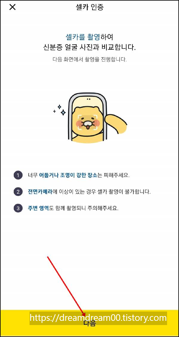 5. 신분증 촬영 후 셀카 인증을 진행합니다. 너무 어두운 곳은 피해야 하며 고개를 정면 좌우로 움직이며 화면 지시에 따라 셀카를 촬영합니다.
