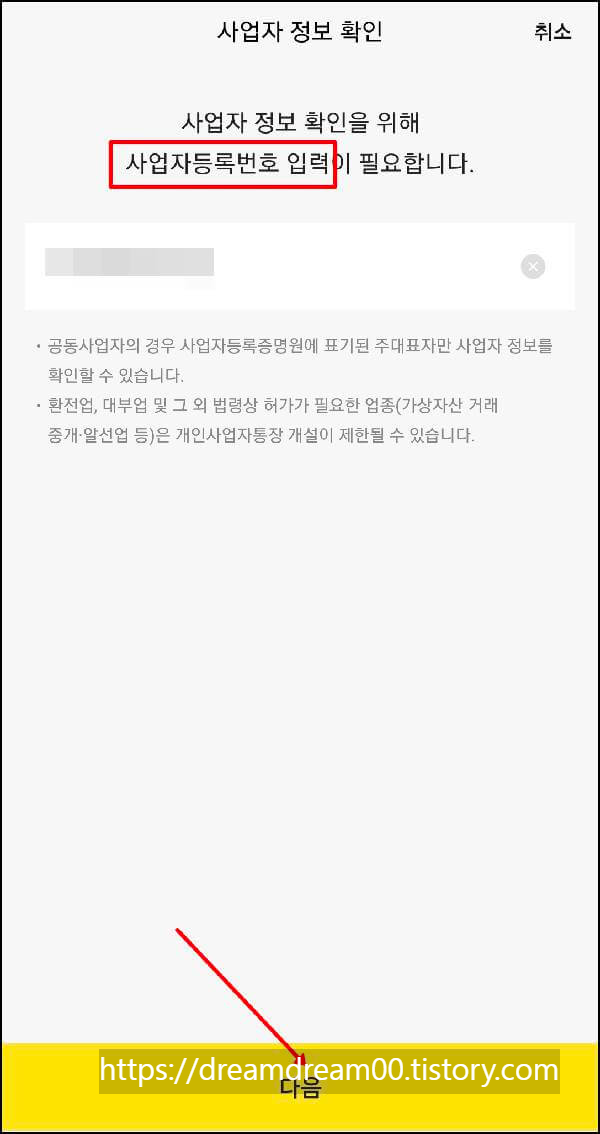 6. 사업자 등록번호를 입력 후 다음을 클릭합니다.
