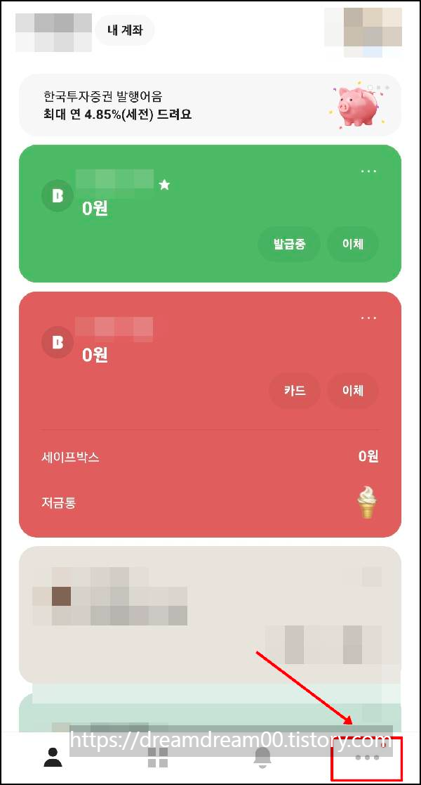 1. 카카오뱅크 메인화면에서 오른쪽 하단 점 3개를 클릭합니다.