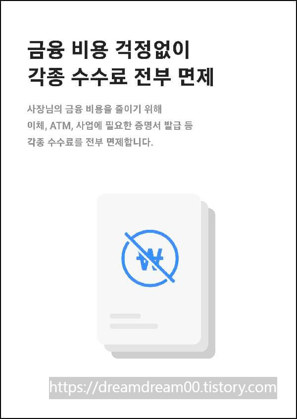 - 이체, ATM, 사업에 필요한 증명서 발급 등 각종 수수료가 면제