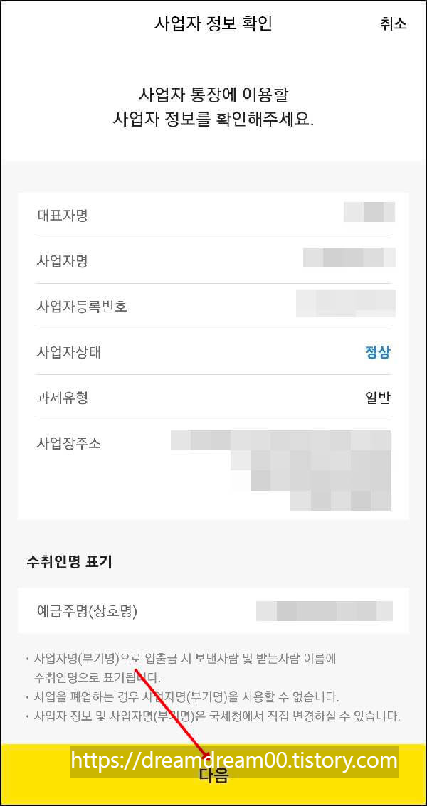 8. 대표자명부터 사업자 관련 내용이 정상임이 확인되면 다음을 클릭합니다.