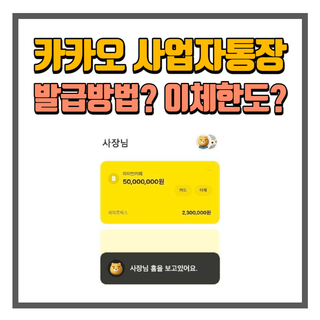 사업자통장과 카드를 발급해야 하지만 은행에 갈 시간이 없어 고민이신가요? 카카오뱅크는 5분이면 서류제출 없이 사업자통장을 발급할 수 있는데요. 카카오통장 사업자통장 및 체크카드 발급 방법에 대해 알아보고 이체 한도도 알려드릴테니, 쉽게 일처리 하세요.