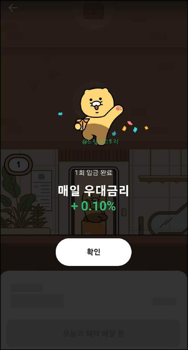 적금을 할때마다 춘식이가 1층씩 올라가 다양한 모습으로 만나 볼 수 있다고 합니다. 또한 한달적금을 완성하면 펜트하우스에서 춘식이를 만날 수 있다고 하는데요. 그 모습 또한 궁금합니다! 꾸준히 입금해 꼭 만기에 성공해 보겠습니다.😊
