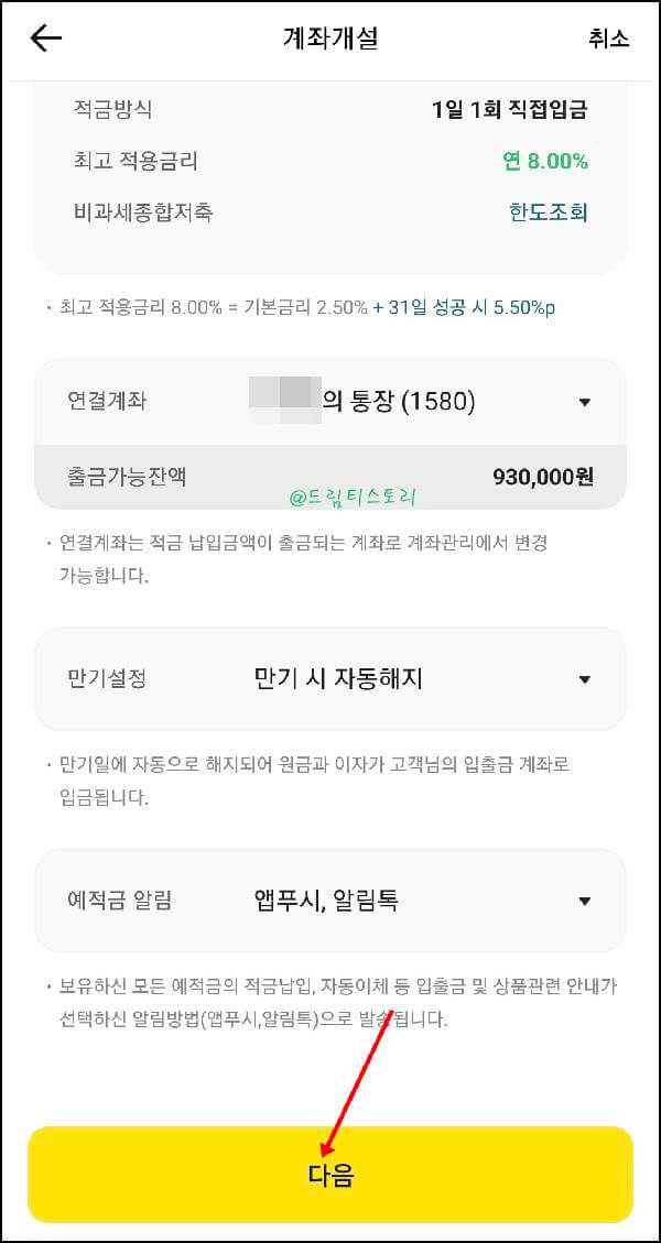 6. 한달적금 내용을 확인하고 다음을 클릭합니다.