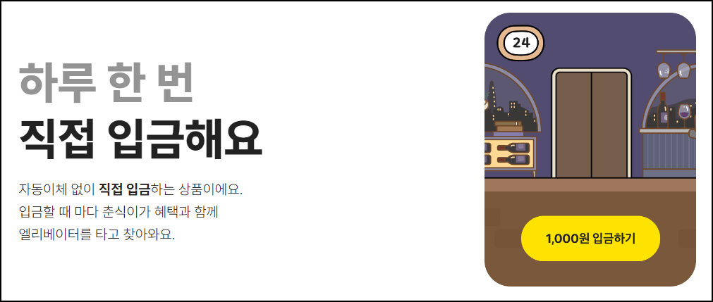 1일 1회 입금만 가능하며 연결된 카카오뱅크 입출금 통장에서만 입금 할 수 있음