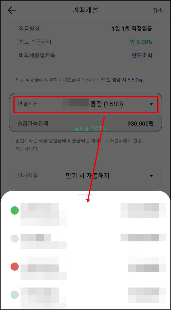 7. 카카오뱅크 입출금 통장 중에 연결계좌를 선택합니다.