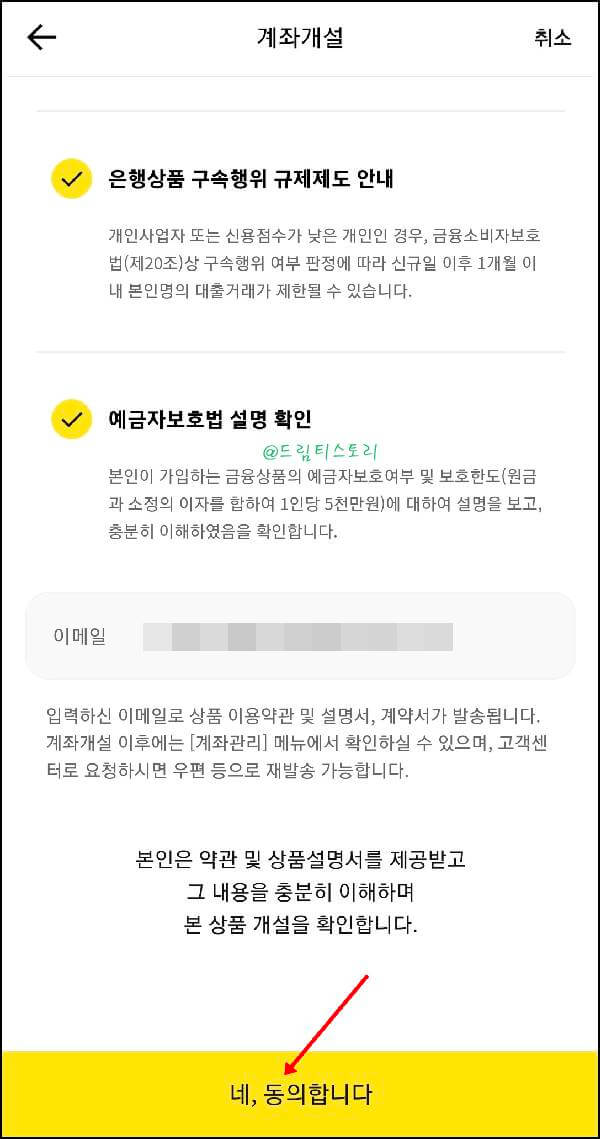 4. 계좌개설 내용에 체크하고 하단의 네, 동의합니다를 선택합니다.
