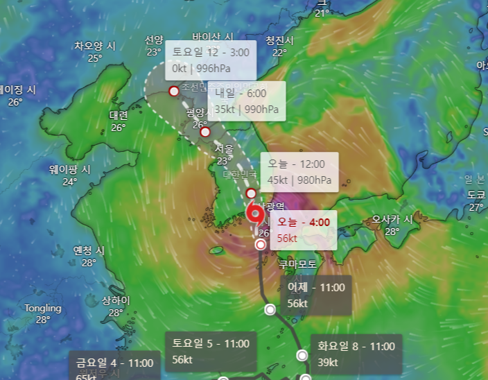 태풍의 속도를 색깔로 나타내고 있어 해당 위치를 클릭 시 태풍의 속도를 상세히 알 수 있습니다.