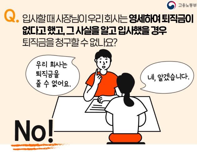 그리고 입사시 사용자와 근로자 간 퇴직금을 지급하지 않는다고 약정했더라도 상시 5명이상 근로하는 사업장이면서 근로자가 1년 이상 근로하고 4주간 평균하여 1주간의 근로시간이 15시간 이상이 된다면 퇴직금을 청구할 수 있습니다.