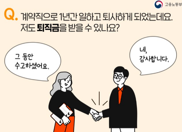 퇴직금은 계속 근로기간이 1년 이상, 4주간 평균하여 1주간의 소정근로시간이 15시간 이상인 근로자라면 받을 수 있습니다.
