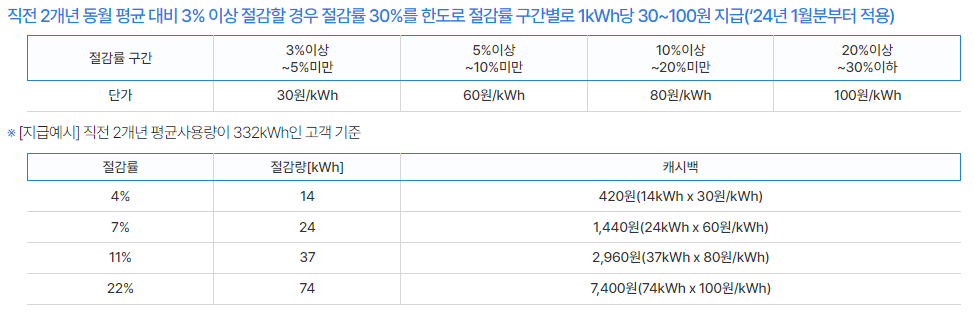 한전 에너지 캐시백이 지급되는 경우는 직전 2개년 동월 평균 대비 3% 이상 절감한 경우 절감률 30%를 한도로 절감률 구간별 1kwh당 30~100원이 지급되는데요.