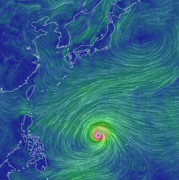 태풍의 속도를 색깔로 표시하고 있으며, 원하는 위치 클릭시 태풍의 속도를 확인 할 수 있습니다.