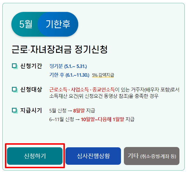 신청/제출 →근로 · 자녀장려금 → 신청하기 → 로그인하여 신청 → 인적·가구사항 → 소득명세 작성 → 전세금 명세 → 계좌번호 작성 → 신청확인 및 전송